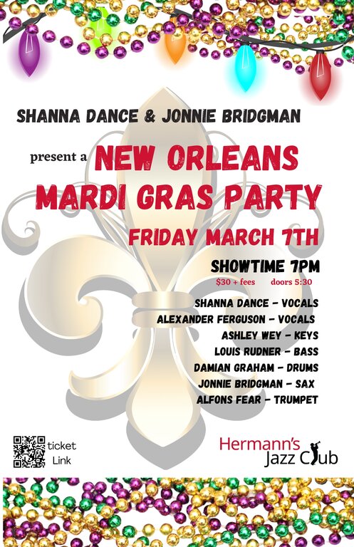 Vocalist Shanna Dance and Saxophonist Jonnie Bridgman present "New Orleans Mardi Gras Party", in Victoria! Shanna and Jonnie are back at Hermann's with a dynamite band for another tribute to the music of New Orleans, this time in honor of Mardi gras. You'll hear and New Orleans Classics in the style of Dr. John, Professor Longhair, Aaron Neville, the Meters, John Cleary, Preservation hall Jazz Band, and many more! The last show at Hermann's by this all-star band was a complete sell-out so get your tickets right away! We encourage the audience members to dress up in full Mardi Gear to make the night more festive. We look forward to celebrating Mardi Gras with you.