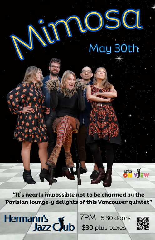The band is made up of Rebecca Shoichet, vocals, Anna Lumiere (piano and accordion), Karen Graves (sax, flute and vocals), Dan Howard (bass) and Bernie Arai (drums). Although every member of Mimosa is also active on the Canadian music scene in many other groups, the band is celebrating its 25th year anniversary in 2024 and has developed a unique performance that will take you on an unforgettable journey into time and sound.