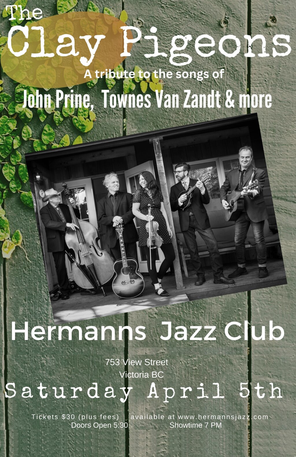 7:00 PM - 9:00 PM doors at 5:30 PMBased out of Victoria, BC, The Clay Pigeons bring a fresh approach to some of the greatest songs written by the greatest American songwriters....John Prine, Iris Dement, Townes Van Zandt, Blaze Foley, Willie Nelson and others. The Clay Pigeons was first conceived by Rachelle Reath, Aaron Watson and Kelly Fawcett, members of the popular Tom Waits tribute, The Beautiful Maladies and features Victoria bass master, Joey Smith and mandolin virtuoso Brad Shipley from Gabriola Island. Expect to hear beautiful songs, big vocal harmonies and stellar instrumental arrangements from 5 of the coasts most celebrated musicians.
