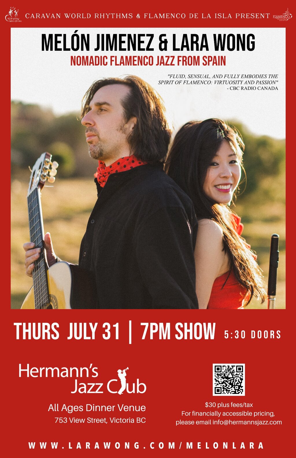 7:00 PM - 9:00 PM doors at 5:30 PMRooted in flamenco and tinted with jazz, Melón Jiménez & Lara Wong’s music echoes flamenco’s nomadic roots—from India to Africa to Latin America. Together, they share a unique musical dialogue between the Indian bansuri and the flamenco guitar—mysterious, bold, and passionate.