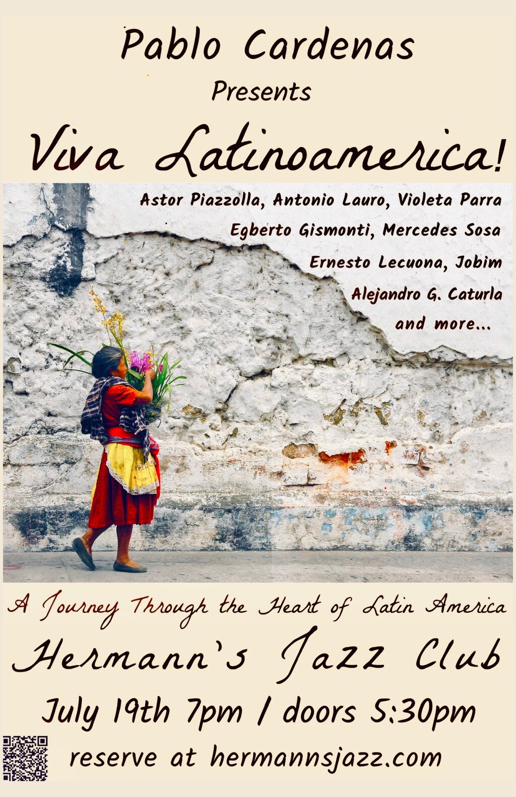 7:00 PM - 9:00 PM doors at 5:30 PMWorld class Cuban pianist Pablo Cardenas presents a show dedicated to the Latin American musical legacy at Hermann’s Jazz Club, with music from Astor Piazolla (Argentina), Chabuca Granda (Peru), Violeta Parra (Chile), Egberto Gismonti (Brazil), Ernesto Lecuona (Cuba), Antonio Lauro (Venezuela), Mercedes Sosa (Argentina) and more.